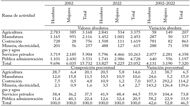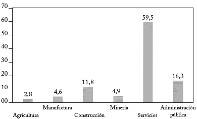El peso de los sectores ha cambiado notablemente: la agricultura, la manufactura y la administración pública se han reducido (del 20,1% al 14,6%, del 13,5% al 10,6% y del 22,4% al 20,5%, respectivamente), mientras que ha aumentado el peso de la construcción (del 4,8% al 7%) pero, sobre todo, el de los servicios, que ha pasado del 37,5 al 44,5% (Tabla 5).