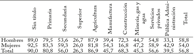 Es muy superior al promedio en la agricultura y la construcción, alrededor del promedio en los servicios privados, por debajo del promedio en la manufactura y el sector minero, y muy por debajo del promedio en el sector público.