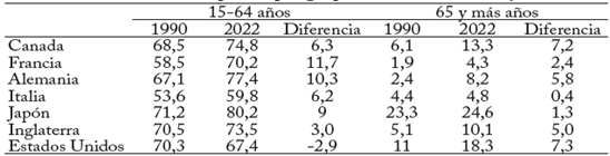 El examen de los índices económicos de dependencia de los diferentes grupos poblacionales muestra que Japón es el país donde los adultos mayores representan el grupo más relevante en términos porcentuales, con un 48,3%; Estados Unidos lidera en cuanto al peso de niños en edad preescolar y estudiantes, con un 55,3%; Italia lidera en cuanto a los no participantes en la fuerza laboral en edad laboral (30,7%). Canadá, Francia y Alemania presentan situaciones más equilibradas, pero también una polarización más pronunciada entre jóvenes y adultos mayores (Tabla 17).