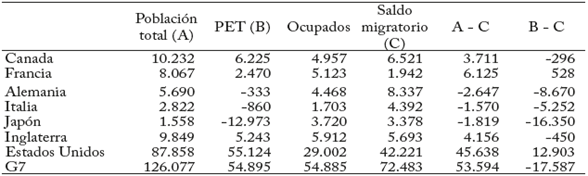 La última observación se refiere al rol de los flujos migratorios en relación con las tendencias demográficas y el mercado laboral. Los datos muestran claramente que durante el período considerado, todos los países del G7 han experimentado una notable escasez de mano de obra que se ha abordado de dos maneras: recurriendo a considerables flujos migratorios y/o aumentando las tasas de ocupación (Tabla 16).
