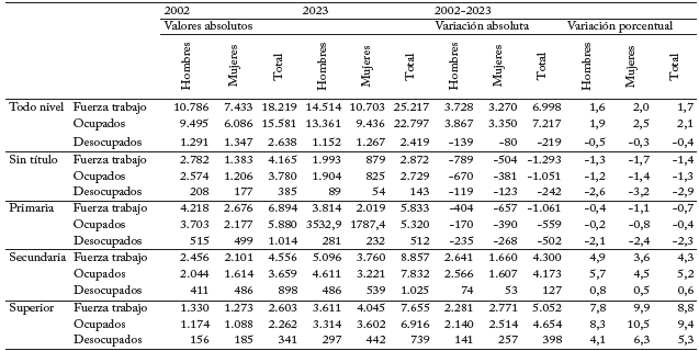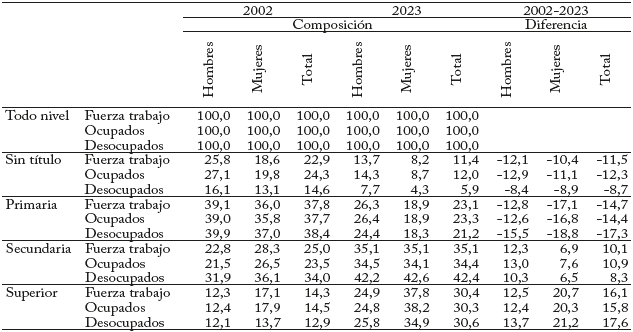 Esto se traduce en un marcado aumento del nivel educativo promedio. Se destaca, en lo que respecta a los ocupados, que en 2002, el nivel educativo de mayor peso era la escuela primaria, que representaba el 37,7%, mientras que en 2023 era la escuela secundaria con el 34,4%. Además, en la actualidad solo un tercio de los empleados tiene como máximo la escuela primaria (frente a un porcentaje de más del 60% en 2002) y el 31,3% tiene un título de escuela secundaria.