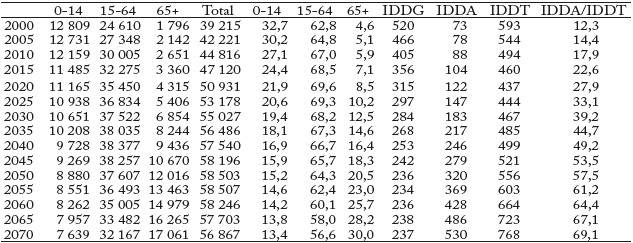 En el caso de Colombia, en el año 2000, cada 1,000 miembros de la PET tenían a cargo 593 jóvenes y ancianos; en 2020, la carga tocó un mínimo de 437, pero debería aumentar a 521 en 2045 y a 768 en 2070. También se observa que el peso del componente de adultos mayores (IDDA/IDDT) pasa del 12,3% en 2000 al 53,5% en 2045 y al 69,1% en 2070 (Tabla 8).