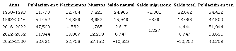 Los valores absolutos de nacimientos, muertes y migraciones nos permiten completar esta breve descripción del comportamiento de la población total y sus determinantes (Tabla 1). Los nacimientos anuales alcanzaron un máximo de más de 900.000 a principios de los años 90, para luego comenzar a disminuir. En 2052, igualarán las muertes en un nivel de 550.000 y deberían caer por debajo de 400.000 a finales del siglo. La interacción entre nacimientos y muertes llevó a un crecimiento máximo de la población total (más de 700.000 personas) a principios de los años 90, coincidiendo con el máximo de los nacimientos. El crecimiento actual, que ha vuelto a valores tendenciales después del COVID-19, es de aproximadamente 430.000 personas al año y debería anularse en 2052, como ya hemos visto. En los siguientes 48 años, en ausencia de migraciones, la población de Colombia debería disminuir en más de 10 millones de personas, como se destaca en la Tabla 1, que muestra la contabilidad demográfica para períodos relevantes de 1950 a 2100.