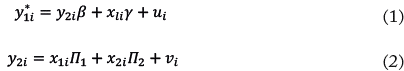 Donde i=1,..., N, y2i es un vector 1×p 1xp variables endógenas, x1i es un vector 1×k variables exógenas, x2i es un vector 1×k2 de instrumentos, con la ecuación para y2i escrita en forma reducida. Se supone además que (ui , vi ) ~ N(0, Σ), donde σ11 se normaliza a uno para identificar el modelo. β y γ son vectores de parámetros estructurales, y Π1 y Π2 son matrices de parámetros de forma reducida. Este es un modelo recursivo: y2i aparece en la ecuación para y*1i , pero y*1i no parece en la ecuación para y2i ; y*1i , pero sí se observa