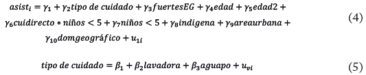En la ecuación (4) se incluyen como variables de control los estereotipos de género deljefedel hogar, la edad, la etnia, lazona, una interacción entre eltipode cuidadoylapresencia deniñosmenores de cinco añosen el hogar, y una variableregional.