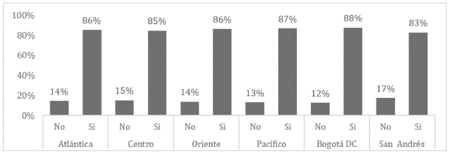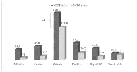 Los datos muestran que en las regiones Atlántica y Centro, alrededor del 60 % de los niños y niñas viven en hogares con fuertes estereotipos de género; le siguen de cerca la región Oriental y la Pacífica, con un 58 % y 50 % de niños que viven en hogares con fuertes estereotipos de género, respectivamente. Solo en Bogotá y en la Isla de San Andrés hay un mayor porcentaje de niños y niñas que viven en un hogar donde no hay un fuerte estereotipo.