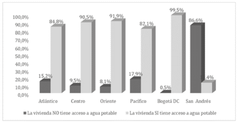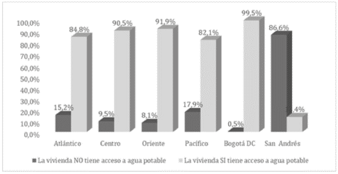 Otro elemento considerado en la literatura que puede ayudar a explicar la cantidad de tiempo dedicado en los hogares, y que también influye en las responsabilidades asignadas a los niños y las niñas, es el acceso al agua potable, especialmente en áreas rurales (Assaad et al., 2010b, p. 6; Admassie, 2003, p. 175). En las cuatro regiones incluidas en la encuesta, el acceso al agua potable por parte de los hogares supera el 80 %. La situación es muy diferente en los dos dominios adicionales incluidos en la encuesta, ya que en Bogotá este porcentaje es del 99,5 %, mientras que en la Isla de San Andrés es tan solo del 13,14 %.