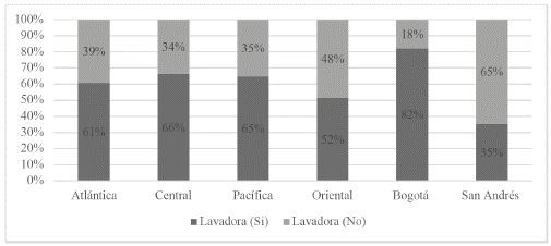 En el caso del acceso a las lavadoras, el dominio geográfico con mayor acceso a este electrodoméstico es Bogotá, donde el 82 % de los niños viven en un hogar que cuenta con lavadora. Le siguen las regiones Central, Pacífica y Atlántica, con un 66 %, 65 % y 61 %, respectivamente. Finalmente, el dominio geográfico con menor acceso a la lavadora es San Andrés, con un 35 %.