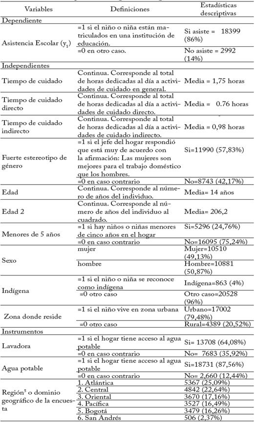 La variable de edad y su valor al cuadrado se han utilizado en modelos de asistencia escolar y de trabajo infantil para evidenciar el efecto que tienen sobre estas variables los diferentes rangos etarios, así como la existencia de rendimientos decrecientes de la edad (Assaad et al., 2010b; Dammert, 2009; Getinet & Beliyou, 2012). Estos fenómenos han demostrado no ser neutrales al género; el sexo de los niños y las niñas es relevante en las decisiones de los hogares respecto a la asistencia escolar y las actividades domésticas (Favara, 2012; Tuwor & Sossou, 2008; Dammert, 2009). La estructura del hogar también es determinante en las decisiones de escolaridad y cuidado; por ello, se incluye en el análisis la variable de presencia de niños menores de cinco años en el hogar, así como una interacción entre el cuidado directo y dicha presencia (Getinet & Beliyou, 2012; Levison et al., 2001). Otras variables tradicionalmente incluidas en el análisis de la escolaridad y el cuidado son la etnia y la ubicación en zonas rurales o urbanas (Zapata et al., 2011; Goulart & Arjun, 2008).