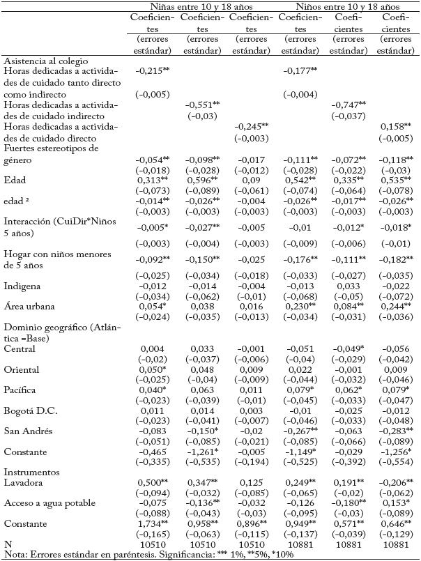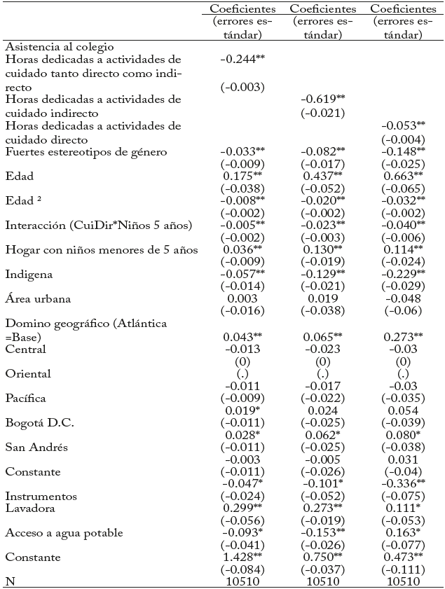 La tabla 2 muestra los resultados de la estimación para dos especificaciones diferentes del modelo, en las cuales se relaciona la asistencia escolar con el número total de horas dedicadas a las actividades de cuidado en general, al cuidado directo y al cuidado indirecto. Esta estimación se realiza de manera independiente para cada sexo.