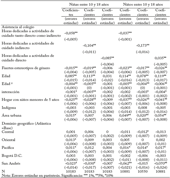 En el caso de la asistencia escolar y las horas dedicadas por los niños y niñas a los diferentes tipos de cuidado, se encontró que el signo es el esperado en la gran mayoría de los casos y que la variable es significativa en todos ellos. Esto indica que la probabilidad de asistir al colegio, tanto para las niñas como para los niños, disminuye cuando aumenta el número de horas dedicadas al cuidado en general, así como al cuidado directo o indirecto en particular. Esto es congruente con los resultados de Assaad et al. (2010a), quienes también encuentran una relación negativa entre la asistencia escolar y el trabajo infantil ampliado por actividades del hogar. En esa misma línea, Kruger et al. (2010) encuentran que, si la definición de trabajo incluye las tareas del hogar, es menos probable que las niñas estén exclusivamente en la escuela y más probable que trabajen en comparación con los niños.