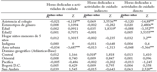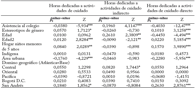 Como se puede observar en la tabla 4, se rechaza la hipótesis nula de que los coeficientes correspondientes al cuidado directo sean iguales entre niños y niñas, así como entre las zonas rural y urbana para el cuidado en general y el cuidado directo. También se rechaza la hipótesis de que los coeficientes asociados a la edad sean iguales en el caso del cuidado directo e indirecto.