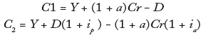 La restricción presupuestal del consumidor financiero, que acota sus utilidades, está definida por el ingreso disponible. En el primer periodo, éste está compuesto por el ingreso más los créditos recibidos menos los depósitos, en el periodo futuro está integrado por el ingreso, la devolución de los depósitos y los intereses correspondientes, menos la amortización de los créditos y el pago de los respectivos intereses, tal y como se muestra se muestraa continuación: