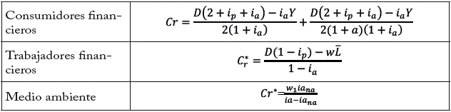 Adicionalmente, se consideran dos tipos de consumidores financieros: por un lado, el consumidor tradicional, cuyo consumo de crédito depende, entre otros factores, de los precios (es decir, de la tasa de interés); y por otro lado, el consumidor que incorpora en su utilidad aspectos sociales y ambientales, es decir, que demanda una proporción adicional de crédito en función de condiciones ambientales y sociales.