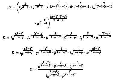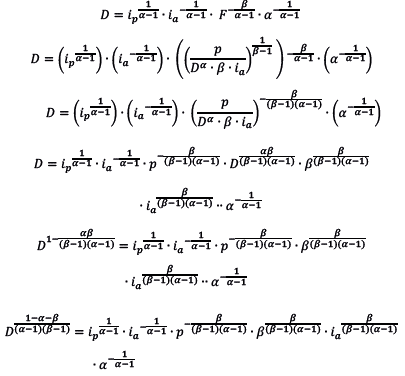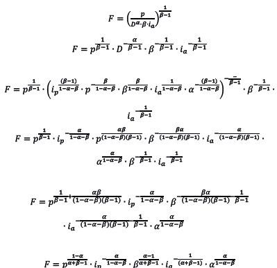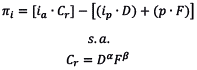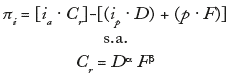Como se mencionó, la utilidad de la banca está dada por la diferencia entre los ingresos y los costos. Los ingresos corresponden a los créditos multiplicados por la tasa de interés activa, menos: (i) los depósitos multiplicados por la tasa de interés pasiva y (ii) los factores de producción multiplicados por el precio correspondiente. En este sentido, a continuación, se presenta una función de producción tipo Cobb-Douglas donde los exponentes representan las elasticidades correspondientes de cada insumo (D) o factor (F).
