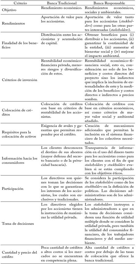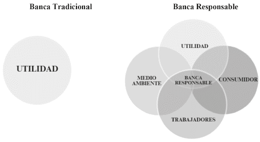 De la tabla anterior se observa que, aunque las actividades llevadas a cabo por la banca tradicional y la Banca Responsable pueden ser las mismas (intermediar entre el ahorro y el crédito), sus objetivos y su modo de actuación en el mercado son diferentes. La manera en que cada una de ellas maximiza su bienestar o utilidad también es distinta. Tal como se muestra en la Tabla No. 2, mientras la banca tradicional obtiene beneficios al maximizar la utilidad, la Banca Responsable obtiene beneficios tanto al maximizar la utilidad como al aumentar el bienestar social y mejorar el impacto ambiental.