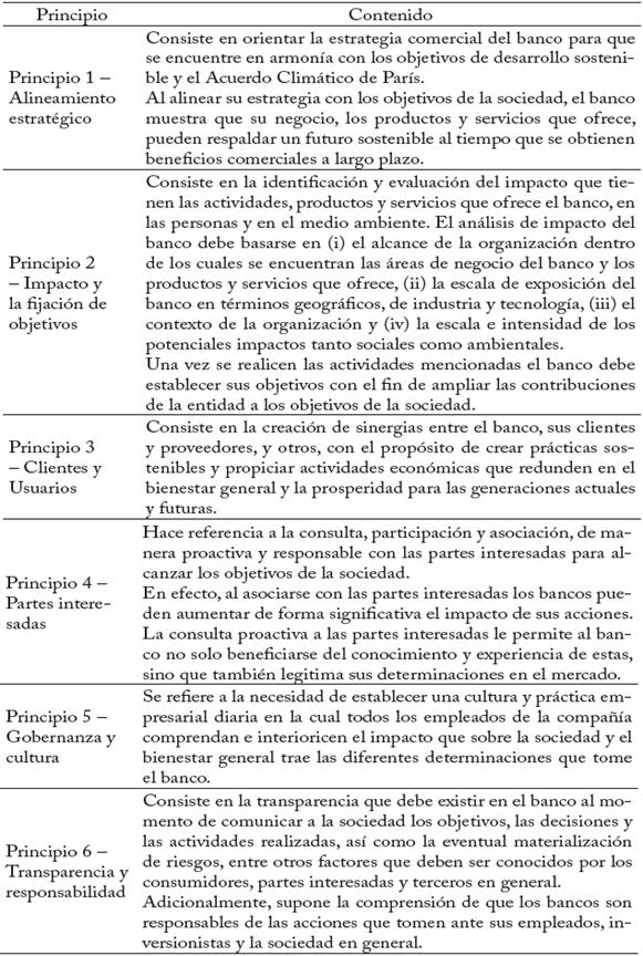 La Iniciativa Financiera del Programa de las Naciones Unidas para el Medio Ambiente (UNEP FI, por su sigla en inglés) expidió el documento guía que contiene los Principios de la Banca Responsable.13 En la Tabla No. 1 se presentan dichos principios, así como el contenido de cada uno de estos: