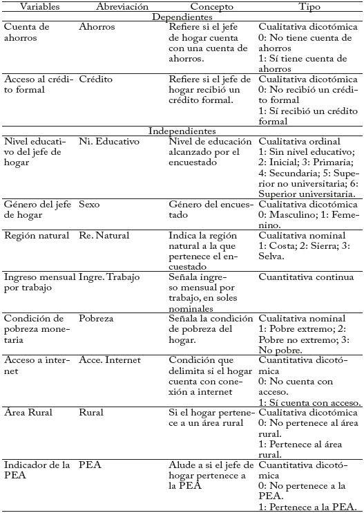 El estudio se basó en un enfoque cuantitativo, de tipo descriptivo y probabilístico, con el objetivo de determinar la probabilidad de inclusión financiera en los hogares, tomando en cuenta factores socioeconómicos, tecnológicos y geográficos. Se utilizó un diseño de corte transversal no experimental. En este sentido, se planteó la estimación de dos variables dependientes: el acceso a una cuenta de ahorros, que representa la inclusión financiera de carácter voluntario, y el acceso al crédito formal, que implica mayores exigencias para formar parte del sistema financiero. Esta metodología es coherente con la empleada por Fungácová y Weill (2014).