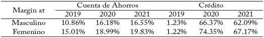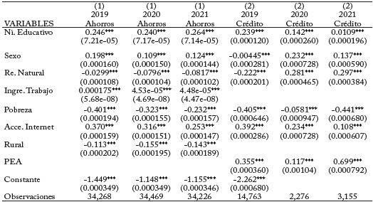 En el Cuadro 2, se observa que las variables explicativas son significativas al 1%, reflejando distintos impactos al diferenciar el ahorro como un activo financiero y el crédito como un pasivo que facilita financiamiento. Además, se nota que la constante es negativa en el modelo cuya variable dependiente es el acceso al ahorro. En el caso del modelo de acceso al crédito formal, esta situación solo se presenta en 2019, lo cual abre la posibilidad de incluir variables explicativas adicionales en investigaciones futuras que aborden esta temática. Asimismo, en cuanto a la significancia conjunta en la distribución chi-cuadrado, el modelo indica un nivel de confianza del 95%.