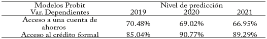 Por último, en el Cuadro 3 se presenta el nivel de predicción de los modelos Probit, evaluando así la significancia conjunta en modelos de corte transversal. En este contexto, el porcentaje corresponde a la tasa global de clasificación correcta del modelo, basada en la tabla de clasificación generada mediante el software Stata.