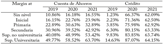 Respecto a la hipótesis H2: "El nivel educativo tiene un efecto positivo en la inclusión financiera", el análisis de efectos marginales presentado en el Cuadro 4 indica que la variable "nivel de educación" es significativa en ambos modelos, con un impacto más pronunciado en el modelo de acceso a crédito. Las estimaciones muestran que el nivel educativo tiene un efecto significativo y positivo en la disponibilidad de cuentas de ahorro y crédito, lo que confirma la hipótesis H2.