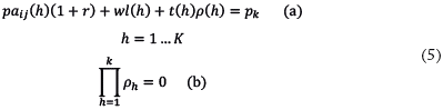 En este sistema, p corresponde al vector de precios de los insumos aij ; r representa el beneficio del productor; w el salario; l, el número de trabajadores o el volumen de trabajo empleado; t, el área de suelo y p la renta del suelo. En la primera ecuación 5(a), con el precio del bien se paga el costo de uso del capital, en el segundo se paga a los trabajadores y el último es el pago de la renta del suelo por cada tipo de suelo. A la derecha se tiene el precio de la k-ésima mercancía. Con la segunda ecuación 5(b) se indica que la renta del suelo no hace parte de los precios de los bienes, lo que nos remite a la ecuación 1.