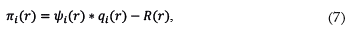 donde el beneficio que puede capturar el productor depende de la renta que ofrezca para poderse quedar en la localización r. La renta de equilibrio de toda la ciudad, en cualquier punto de ubicación, se expresa por la envolvente de las máximas rentas ofrecidas en las distintas actividades urbanas siguiente expresión: