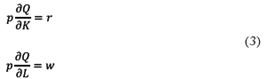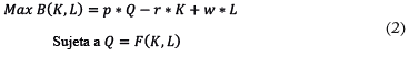 Sea Q = f(K, L). En donde Q es el producto y K y L son los factores productivos. Si denotamos la razón de cambio