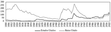 En el Gráfico 1 se presenta una panorámica de la evolución de la deuda pública expresada en términos porcentuales del PIB, para los últimos 220 años. El Reino Unido, eje de la economía mundial en el siglo XIX, y los Estados Unidos en el siglo XX son los protagonistas en esta primera escena2.