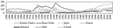 En el Gráfico 2 se hace el seguimiento de la razón porcentual de la deuda pública al PIB para varias economías desarrolladas, además de las ya citadas de los Estados Unidos y del Reino Unido3. Se consideran siete países, a saber, Alemania, Canadá, Estados Unidos, Francia, Italia, Japón y Reino Unido, economías que llegarían a conformar el G7 en 1975. En las dos últimas décadas del siglo XIX, y en las dos primeras del XX, Francia e Italia conquistaron cifras de endeudamiento muy por encima de las de los demás países. Así, mientras en estos países el endeudamiento se mantuvo alrededor del 100% del PIB, en el Reino Unido se debatía entre el 40 y el 50%; más adelante, entre 1920 y 1924, la deuda francesa se sostuvo en un promedio del 208,1%, al tiempo que la italiana no bajó del 140,5%; de hecho, la francesa arribó a la cumbre del 237% en 1921, cuando para entonces, la del Reino Unido ya había retomado una senda de crecimiento persistente desde la Primera Guerra Mundial y alcanzaba cimas que en la primera mitad de los años veinte superaban el 170%.