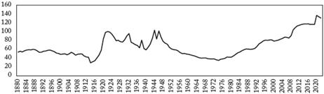 Al promediar las cifras de las series exhibidas en el Gráfico 2 se obtiene la serie representada en el Gráfico 3. Es una imagen más diáfana de lo acontecido desde finales del siglo XIX, a saber, una tendencia decreciente hasta el estallido de la Primera Guerra Mundial, seguida por el desborde del endeudamiento ocurrido entre dicha conflagración y la culminación de la Segunda Guerra Mundial; luego vendría el rápido desvanecimiento de la deuda durante el auge del crecimiento mundial que caracterizó la segunda posguerra, y finalmente, el ascenso prácticamente ininterrumpido de la deuda desde mediados de los años setenta. Los puntos más bajos del endeudamiento se alcanzaron en 1914 con el 28,5%, y en 1974 con el 33,7%. Hacia 1975 se habría podido pensar que en la cresta de endeudamiento del período de en-treguerras se habrían alcanzado las mayores cumbres de la deuda, pero para entonces no se avizoraba la evolución posterior que la llevaría escalonadamente hasta alcanzar el 133% en 2021.