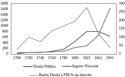 En el Gráfico 4 discurren la evolución de la deuda pública, del ingreso nacional, y de la razón porcentual entre estas dos variables a lo largo del período 1700-1901 para la Gran Bretaña. La deuda, que al inicio del siglo XVIII era equivalente al 50% del PIB, creció hasta los años sesenta de dicha centuria a una tasa anual del 3,28%, al tiempo que el PIB lo hizo al 0,65%; ya para entonces, la razón deuda a PIB llegaba al 137,4%. En las siguientes seis décadas, hasta 1821, en plena revolución industrial, el crecimiento medio anual del PIB fue de 2,2% mientras que el de la deuda fue de 3,4%. Así, la deuda pública en relación con el ingreso nacional pasó de virtualmente cero en el momento de la "Revolución Gloriosa" de 1688 al 170% al culminar la Guerra de Independencia de los Estados Unidos, y al 270% tras las guerras Napoleónicas. Y después de su largo descenso de ocho décadas se encontraba alrededor del 40% al comenzar el siglo XX.