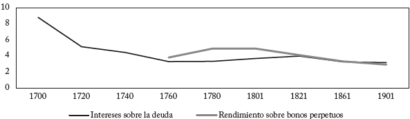 La experiencia británica fue proverbial desde comienzos del siglo XVIII. A pesar del crecimiento empinado de la deuda pública como proporción del PIB en los setecientos y ochocientos, hasta niveles que rebasaron el 270% (Gráfico 4), expresiones como repudio de la deuda, o moratoria, no hicieron parte del lenguaje de la opinión pública británica. Los indicadores convencionales como la tasa de interés promedio sobre la deuda, o el rendimiento sobre los títulos irredimibles o Consols (palabra derivada de "consolidated annuities" a partir de un proceso de consolidación de deudas en 1751) no dejaron entrever que los mercados de capitales estuvieran ansiosos acerca de eventuales cesaciones de pagos, tal como se aprecia en el Gráfico 5. Hubo también razones de economía política: tanto los terratenientes como los tenedores de bonos contaban con una amplia representación en la Cámara de los Comunes85.