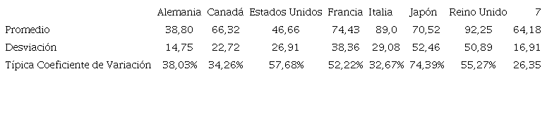 En la Tabla 1 se presentan estadísticas básicas de las series para el último siglo y medio. El Reino Unido e Italia aparecen como las economías con los mayores promedios, del orden del 90%. Les siguen Francia y Japón con cifras entre el 70 y el 75%. El Canadá se asemeja al promedio del G7, los Estados Unidos no alcanzan al 50%, y Alemania se ubica por debajo del 40%.