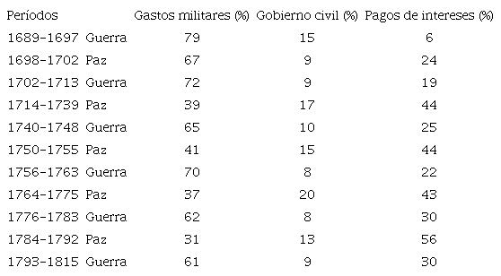 En Gran Bretaña la proporción de gastos de guerra financiada con empréstitos fue del orden del 31% en el período de la Guerra de Sucesión en España (1702-1713), cuando los préstamos conseguidos para tal fin arribaban a £29,4 millones; y del 40% en la época de la Guerra de Independencia de los Estados Unidos (1776-1783), cuando los préstamos llegaban a £94,5 millones. Al sobrevenir las guerras con Francia en la última década, se adoptó el impuesto sobre el ingreso en 1799 para costear el extraordinario gasto militar, de modo que la proporción financiada con empréstitos se redujo sustancialmente; así, al término de las Guerras Napoleónicas en 1815, el porcentaje financiado con empréstitos fue de apenas el 26%; para entonces los empréstitos con propósitos militares superaban los £440 millones. En total, los préstamos recolectados para enfrentar los conflictos mencionados superaron los £670 millones, equivalentes al 33% de los costos militares involucrados. El impuesto sobre el ingreso fue suprimido al inaugurarse el período de paz en 1815, y los analistas de entonces concluyeron que en el caso de guerra no debería omitirse el uso de los impuestos en su financiación.71.