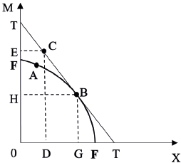 Si hay una reasignación de trabajadores de M a X, tal que el pleno empleo se alcanza y la producción nacional se ubica en el punto B'' sobre la FPP, entonces puede haber mejoras en el sentido de Pareto, pues, en pleno empleo la FPC se expande en comparación al subempleo.