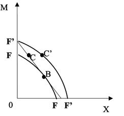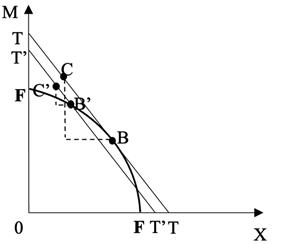 Veamos ahora los efectos sobre el bienestar de una política proteccionista para esta economía. Para proteger a la industria nacional de M, supongamos que el gobierno impone un arancel no prohibitivo a las importaciones de M, y el ingreso recaudado por este arancel se transfiere a los consumidores para que ellos no empeoren por el arancel. Entonces, el precio relativo doméstico de X en términos de M, considerando el arancel, disminuye, lo que provoca que aumente la producción doméstica de M en desmedro de X, hasta ubicarse en el punto B' de la curva FF de la Figura 2.