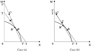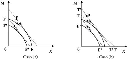 Supongamos que la economía fija un arancel no prohibitivo a M tal que, en ambos casos de la Figura 4, el precio relativo doméstico de equilibrio se representa por la pendiente de la FPP en el punto B', mientras que la modificación de los términos de intercambio se representa por la pendiente de la recta T'T' que pasa por B'. En tal caso, la producción nacional se ubicará en el punto B' mientras que el consumo nacional se ubicará en C'. En el caso (a), se puede ver que C' se revela como preferible a C en el segmento relevante (a la izquierda de B'), al tiempo que se expande su FPC en este segmento, implicando con ello la posibilidad de una mejora en el sentido de Pareto. En cambio, en (b) no sucede nada de esto, por lo que es posible que en C' no exista posibilidad de mejoras en sentido de Pareto con respecto a C.