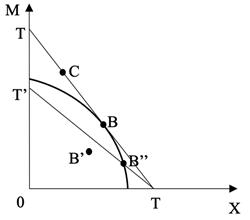 No obstante, dado que el salario real está fijo en un nivel superior al de equilibrio y hay desempleo en la economía, los sectores nacionales no pueden alcanzar ningún punto de la FPP; por tanto, no pueden alcanzar B. Así, supongamos que la producción nacional se ubique en B'. Dado que el sector X es intensivo en trabajo, si una política arancelaria permite encarecer M para estimular la demanda nacional de X, se puede alcanzar la FPP, generando con ello la posibilidad de obtener mejoras en el sentido de Pareto. Gráficamente, esta política arancelaria se representaría por el cambio en la pendiente de la recta TT' en comparación con TT de la Figura 5.