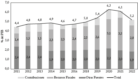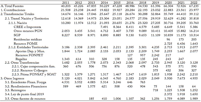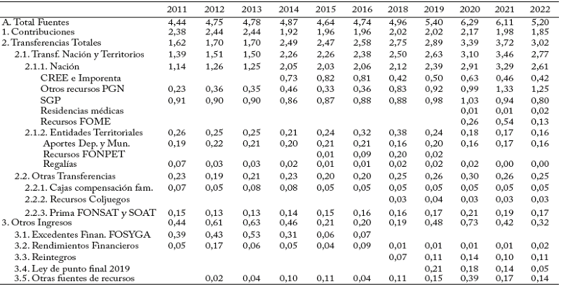Las principales fuentes de recursos del sistema provienen de las cotizaciones a cargo de los empleadores y de los empleados pertenecientes al régimen contributivo y los diferentes recursos de origen fiscal. Adicionalmente, el sistema dispone de aportes de las cajas de compensación familiar y de los rendimientos financieros generados por la administración de los excedentes de caja. En conjunto, las fuentes de recursos han registrado una tendencia creciente, al aumentar de 4,4 % del PIB en 2011 a 5,2% del PIB en 2022, con un máximo de 6,3% del PIB en 2020 (Gráfico 1, Cuadro 1)5. Vale la pena señalar que desde 2019 el sistema recibió recursos adicionales para financiar el Acuerdo de Punto Final y el sistema nacional de residencias médicas, y posteriormente a partir de 2020 para atender la pandemia por COVID-196.