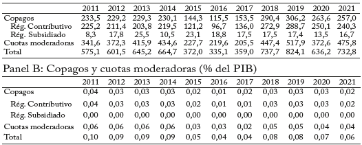 del servicio demandado y tienen como finalidad ayudar a financiar el sistema, de conformidad con el Acuerdo 260 del Consejo Nacional de Seguridad Social en Salud.10 El Cuadro 2 resume los ingresos por copagos y cuotas moderadoras entre 2011 y 2021, recursos que se constituyen en ingresos de las EPS. En 2015 y 2016 se observa una caída tanto en los copagos como en las cuotas moderadoras, lo que se explica por una disminución del valor de la cuota moderadora derivado de cambios introducidos a la base de cotización (Anexo 3).