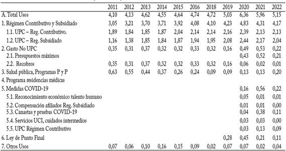 Después del costo del aseguramiento, los usos más relevantes corresponden a los pagos destinados a la financiación de medicamentos, servicios médicos y procedimientos que no están incluidos en el PBS (gasto No UPC) y los gastos destinados a salud pública, programas de promoción y prevención, y más recientemente al pago de la remuneración a los residentes médicos. El reconocimiento de los pagos No UPC se ha realizado a través de diferentes mecanismos, y su costo representó en promedio 0,35% del PIB en el periodo 2011-2022, con un valor mínimo de 0,16% del PIB en el 2019 y un valor máximo de 0,53% del PIB en el 2021. El rubro de salud pública y los programas de promoción y prevención han representado en promedio 0,5% del PIB durante el periodo 2011-2022 y los pagos por residencias médicas 0,01% del PIB entre 2020-2022. Respecto a los recursos destinados a salud pública y a programas de promoción y prevención se observa una reducción en los últimos anos (Cuadro 3, Anexo 3). Esta reducción podría estar asociada a la afiliación de personas al esquema de aseguramiento, quienes previamente recibían atención a través de la red pública hospitalaria.