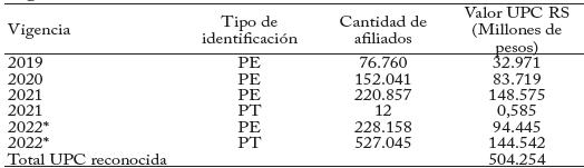 El gasto por concepto del aseguramiento del régimen subsidiado ha tendido a igualarse con el del régimen contributivo, por la disminución de la brecha en la UPC y por el aumento de los afiliados a este régimen. El aumento del número de afiliados al régimen subsidiado se explica, en parte, por la incorporación de la población migrante venezolana con permiso especial de permanencia (PEP) y Permiso de Protección Temporal (PT), de acuerdo con lo ordenado por el Decreto 064 de 2020 y la Resolución 572 de 2022. En agosto de 2022 se encontraban afiliados al régimen subsidiado 755.203 migrantes de origen venezolano. Entre enero de 2019 y agosto de 2022, el costo de las UPC del régimen subsidiado para la población migrante identificada con PE y PT fue de $504 mil millones. Como se observa en el Cuadro 4, el costo ha aumentado durante los últimos cuatro años, con un valor inicial de $32,9 mil millones en 2019 hasta $239 mil millones para agosto de 2022. Es importante anotar que un grupo importante de migrantes está afiliado al régimen contributivo. Como se observa en el Cuadro 5, los migrantes en este régimen aumentaron de 144.7833 en 2019 a 284.328 en julio de 2022. El reconocimiento por UPC, incapacidades, licencias, y programas de promoción y prevención de estos afiliados alcanzó $ 145,6 miles de millones en 2021 y $ 122,3 miles de millones con corte a agosto de 2022.
