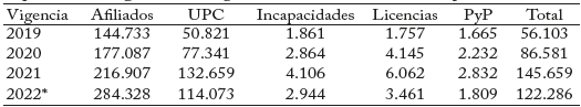 Las EPS reciben la UPC por cada afiliado para la prestación de los servicios de salud. Vale la pena señalar que, pese a la reducción de las cargas parafiscales a las empresas por concepto de salud, el costo del aseguramiento del régimen contributivo es similar a los recursos generados por las cotizaciones. En efecto, durante el periodo 20152022 esta fuente de ingresos es en promedio equivalente al 92% del costo del régimen contributivo.