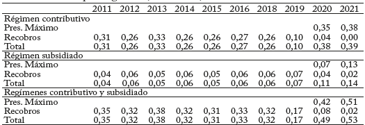 Con respecto a las cifras de recobros por régimen, en el Cuadro 6 se puede observar que los del régimen contributivo se mantienen en alrededor de 0,3% del PIB durante el periodo 2011 - 2018, mientras que los recobros del régimen subsidiado han fluctuado entre 0,04% y 0,06% del PIB en el mismo periodo. En ambos regímenes se presenta un aumento del gasto No UPC para los años 2020 y 2021 debido, en otras razones, al cambio en el mecanismo de acceso a este gasto por los presupuestos máximos.
