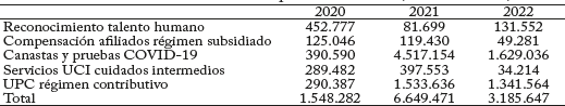 De los recursos del FOME que se destinaron al fortalecimiento del sector salud, a través de la ADRES se canalizaron aquellos destinados a la atención de programas como las canastas para la prestación de servicios y tecnologías en salud destinados a la atención del corona-virus, el reconocimiento y pago de las pruebas de búsqueda, tamizaje y diagnóstico, la compensación económica de afiliados al régimen subsidiado contagiados con COVID-19, el pago de la UPC de los afiliados al régimen contributivo que perdieron el empleo durante la pandemia, los servicios de cuidados intensivos y cuidados intermedios y el reconocimiento económico al talento humano que participó en la atención de los pacientes contagiados. El costo de estos programas ascendió a $1,5 billones en 2020, a $6,6 billones en 2021 y a $3,2 billones en 202217 (Cuadro 7).