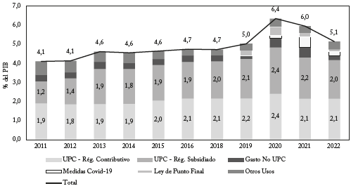 PIB en 2022, con un máximo de 3,5% del PIB en 2021. Dentro de los recursos fiscales se incluyen las rentas destinadas a la financiación de los gastos por la pandemia y los recursos para cubrir las deudas del Acuerdo de Punto Final, que en conjunto representaron 0,4% del PIB en 2020, 0,7% del PIB en 2021 y 0,2% del PIB en 2022 (Gráfico 1). El aumento de los recursos del PGN a partir de 2014 se atribuye a la exoneración otorgada a las empresas sobre los aportes a la seguridad social en salud y al ajuste de la UPC del régimen subsidiado, de acuerdo con la sentencia de la Corte Constitucional T-760 de 2008, que ordenó igualar los planes de beneficios de los dos regímenes8.