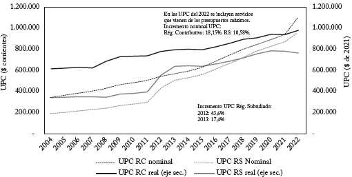 El costo del aseguramiento, en el ano 2022 ascendió a 4,2% del PIB, de los cuales 2,1% del PIB se asignaron al régimen contributivo y 2,0% del PIB al subsidiado. En el Gráfico 3 se presenta la evolución de la UPC en pesos corrientes y en pesos de 2021. Allí se observa una brecha entre el valor de la UPC de los dos regímenes, que se ha venido reduciendo como resultado de la Sentencia de la Corte Constitucional T-760 de 2008 que ordenó la igualación gradual de los PBS. Para el ano 2022, el gobierno tomó la decisión de incorporar en la UPC de los dos regímenes, nuevos procedimientos y medicamentos que previamente se reconocían a través del mecanismo de presupuestos máximos. A pesar del incremento adicional en la UPC del Régimen contributivo y subsidiado, la brecha entre los dos regímenes en pesos constantes se amplió en 202212. Para el 2023 la UPC de los dos regímenes tuvo un crecimiento de 16,5%, que es mayor a la inflación esperada para el año.