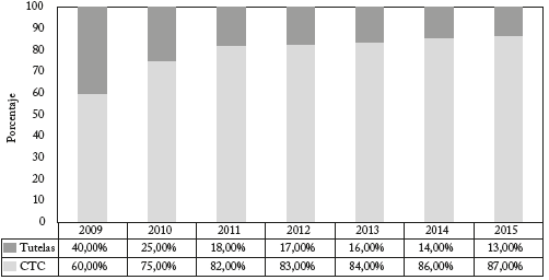 El mecanismo inicial para acceder a los procedimientos y medicamentos no cubiertos por el PBS era la acción de tutela, lo cual generaba recobros al FOSYGA por parte de las EPS13. La resolución 2933 de 2006 estableció los Comités Técnico Científicos (CTC) como el medio idóneo para acceder a medicamentos no cubiertos por el PBS. Dichos comités estaban conformados por diferentes especialistas en salud quienes tenían la facultad de atender las solicitudes de medicamentos presentadas por los médicos tratantes. A partir de la Ley 1122 de 2007, se incentiva el trámite de este tipo de solicitudes a través de los CTC mediante una penalización en el reconocimiento de solo un 50% del valor facturado en aquellas solicitudes aprobadas mediante tutela. Posteriormente, a través de la sentencia T-463 de 2008 proferida por la Corte Constitucional, a los comités también se les otorgó la facultad de aprobar servicios y procedimientos médicos. Para el año 2010 las solicitudes de recobro mediante los CTC equivalían a tres veces las solicitudes a través de la acción tutela (Gráfico 4).