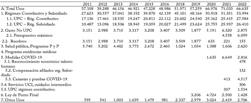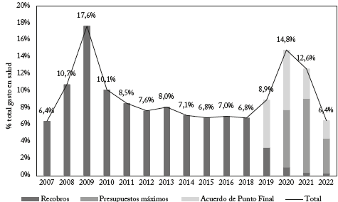 Teniendo en cuenta el impacto en la financiación del sistema de salud y los diferentes mecanismos que se han utilizado para atender el gasto por fuera del PBS, en la siguiente sección se explica en detalle la evolución de este gasto y el Acuerdo de Punto Final que buscaba la cancelación de pasivos de la nación y de entidades territoriales con diferentes entidades del sistema de salud. Asi mismo, se explican las principales fuentes y usos de los recursos utilizados para atender la pandemia por COVID-19.